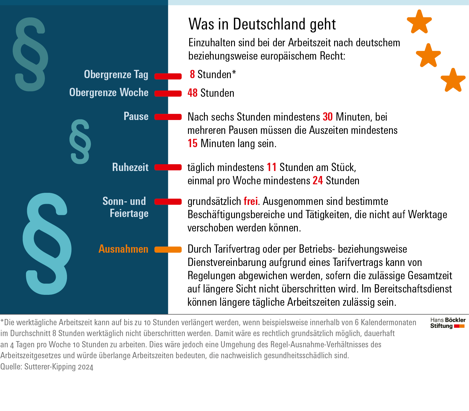 Die Arbeitszeiten in Deutschland sind hoch flexibel. Das zeigt sich nicht nur in einschlägigen Statistiken zu Abend-, Nacht-, Schicht und Wochenendarbeit, sondern auch beim Blick ins Arbeitszeitgesetz, das etwa die Ausweitung der täglichen Arbeitszeit auf zehn Stunden erlaubt.
