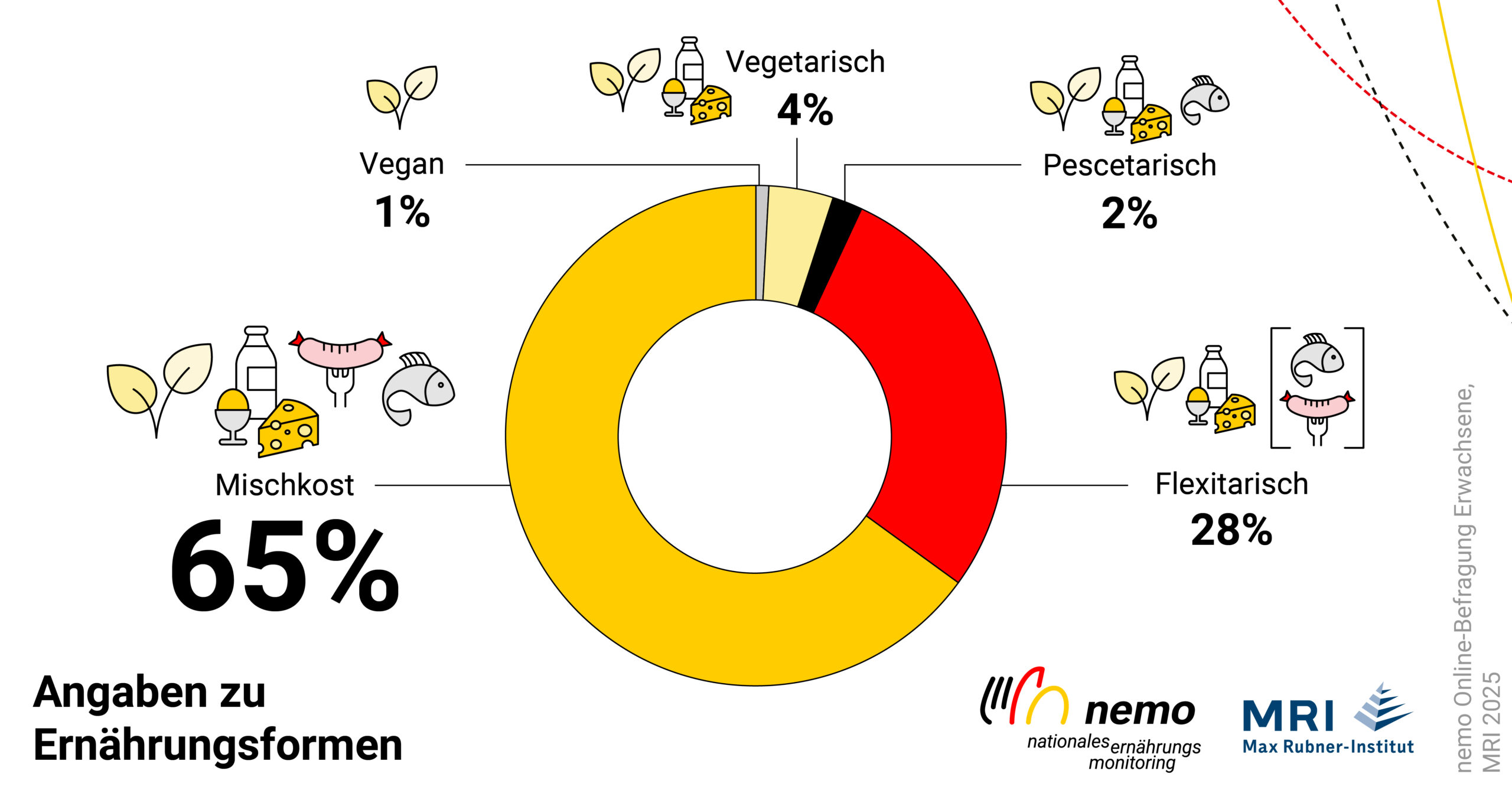 Nach ihrer Ernährungsform gefragt, gaben knapp zwei Drittel der Befragten „Mischkost“ an; gut ein Viertel bezeichnete sich als „Flexitarier“, was maximal zweimal die Woche Fleisch auf dem Speiseplan bedeuten würde. Rund vier Prozent bezeichneten ihre Ernährung als vegetarisch und etwa ein Prozent gab an, sich vegan zu ernähren. Allerdings ergab die Auswertung dieser Daten und die der konsumierten Lebensmittel eine Diskrepanz: aus den Angaben zum Verzehr geht hervor, dass etwa 75 Prozent der Befragten häufiger als zweimal in der Woche Fleisch auf dem Teller haben.